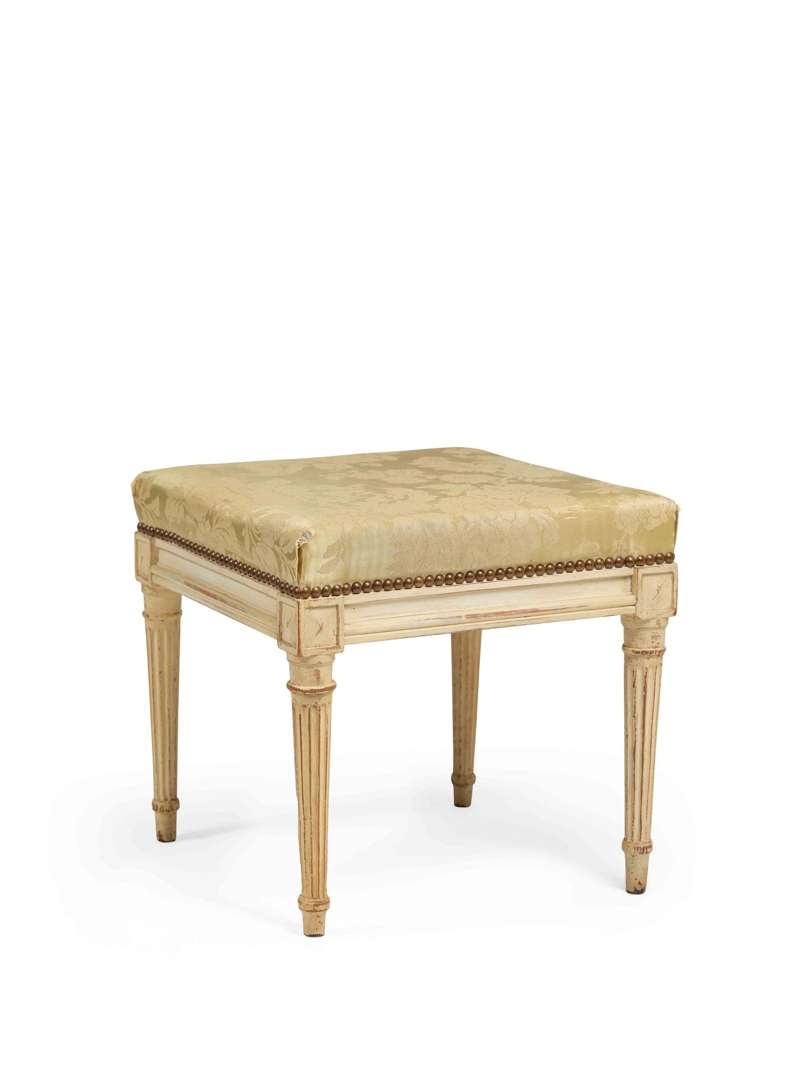 TABOURET en hêtre sculpté et mouluré relaqué crème. Quatre pied fuselés cannelés et dés de raccordements en pointe de diamant.