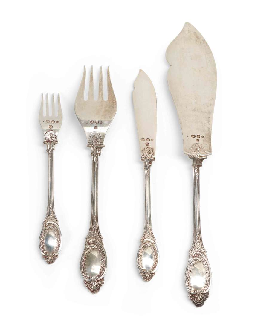 en argent à modèle rocaille. Il comprend un couvert de service, douze