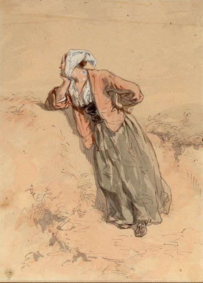 Study of a woman leaning against a parapet, watercolor, pen and gray ink