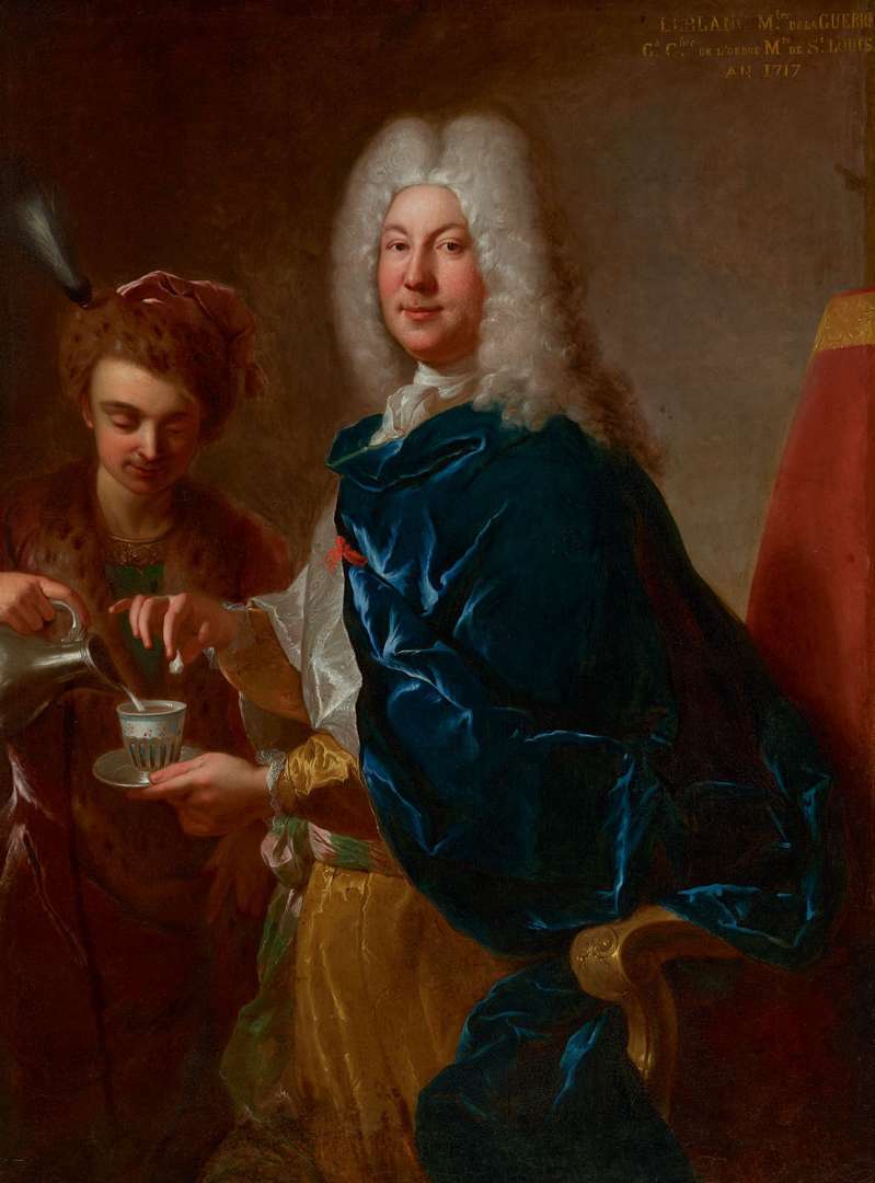fond sobre sur lequel se détache Le Blanc et son servant. Sa virtuosité dans le rendu des carnations, des matières, il ne la consacre qu’à son modèle revêtu d’un habit de soie jaune, contrepoint chromatique au lourd manteau de velours bleu sur lequel la lumière se réfracte merveilleusement. Depuis les années 1710, le peintre avait pris l’habitude d’apposer quelques