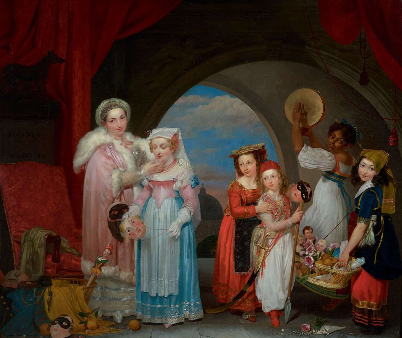 pittoresque de l’Italie contemporaine, motifs Renaissance et masques vénitiens, la joyeuse compagnie s’apprête à partir au rythme clinquant d’un tambour. Quelques derniers ajustements sont apportés par une mère à sa fille que ses amies attendent avec impatience. Le corps déjà tourné vers la sortie, les yeux réclamant leur dernière amie et trépignant d’impatience, nul doute qu’elles aimeraient filer hors du joug maternel. Les vêtements, masques, fruits et fleurs jonchant le sol laissent penser qu’un instant plus tôt, tout un joli fatras a virevolté dans les mains de ces jeunes enfants, trop heureuses des jeux à venir. Le thème est léger, l’atmosphère est joyeuse mais l’apparente frivolité de l’ensemble ne doit pas faire oublier la beauté du coup de pinceau, tout comme les références aux maîtres antérieurs que Van Brée a tant admirés. À l’ombre des voûtes d’une loggia, les références à la Renaissance italienne sont multiples, allant de l’ouverture sur fond de ciel et la silhouette lointaine d’un dôme, de l’architecture du lieu même qui laisse imaginer un palazzo, jusqu’aux tenues
