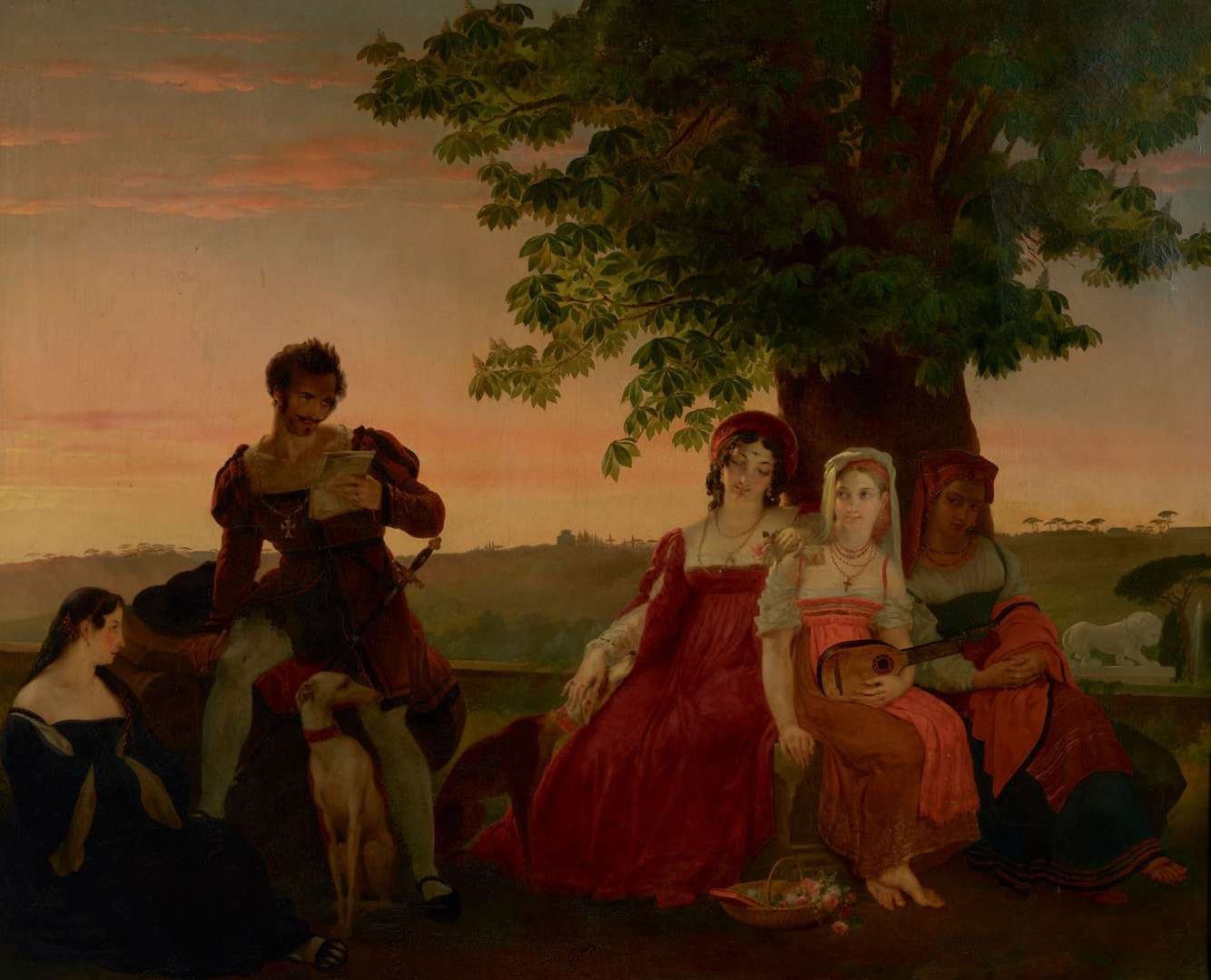 Sur fond de soleil couchant, une assemblée s’est retrouvée dans le jardin d’une villa de la campagne romaine. Un homme vêtu à la modenéo-médiévale paraît en pleine conquête de son auditoire exclusivement féminin dont les yeux ne sont tournés que vers lui. Un échange mutuel de regards est visible entre celui qui déclame et l’une de ses compagnes vêtue de