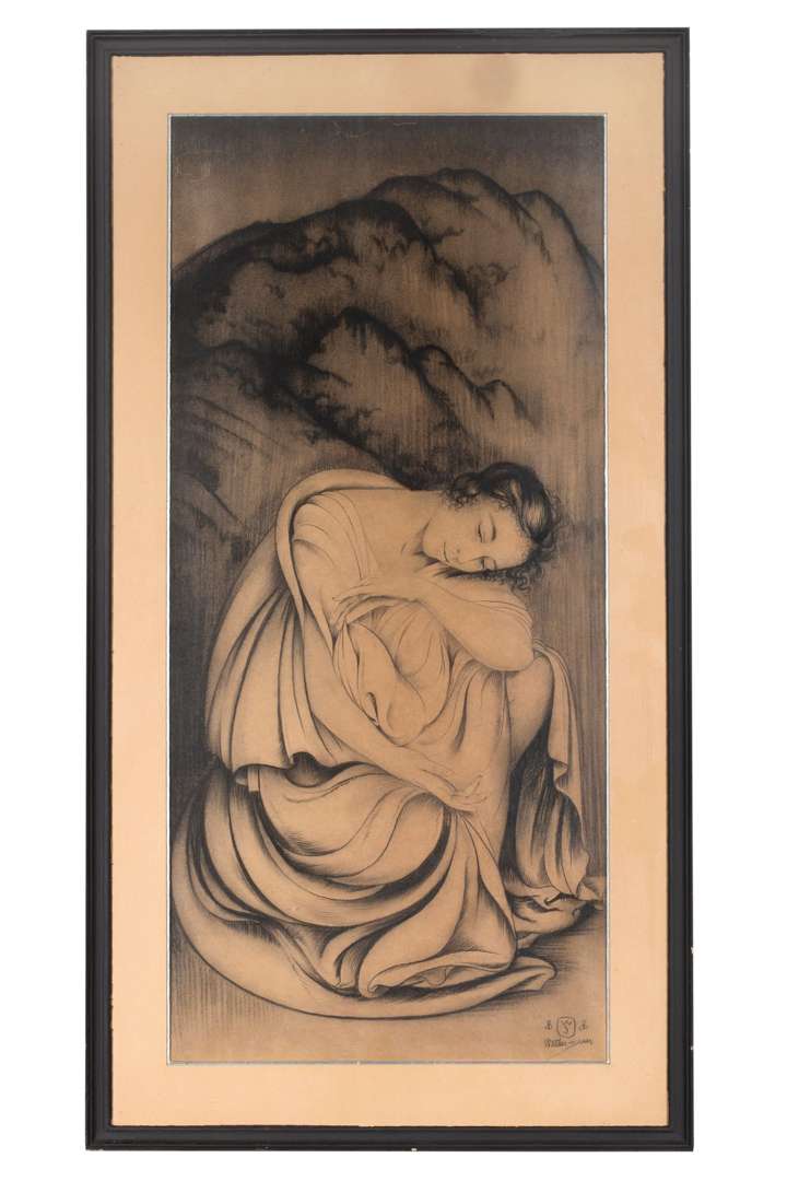 Selon Monsieur Michel Massant, cette oeuvre a été créée aux environs de 1923. Le paysage à l'arrière-plan lui fait penser à un décor japonisant (estampe ou panneau). En effet, d'après lui, Sauer a fréquenté très jeune un magasin d'objets japonais à Bruxelles et ce fusain a été "plus que vraisemblablement réalisé en atelier".