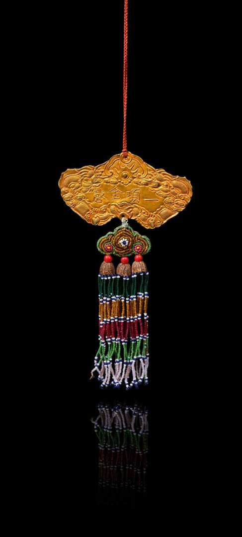 Khanh de 1ere classe pour Français, au type « L'Empereur du Grand Sud », avec les inscriptions « Dai Nam Hoang De Sac Tu » (Décerné par l'empereur d'Annam) et « Nhat Hang Kim Khanh » (Kim Khanh de première classe). Cordon de suspension et pampilles de perles de verre multicolores