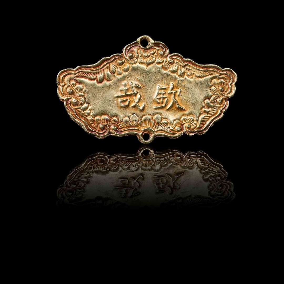 Khanh en or repoussé et ciselé, bordé de rinceaux feuillagés. Une face portant l'inscription "Thanh Thai".