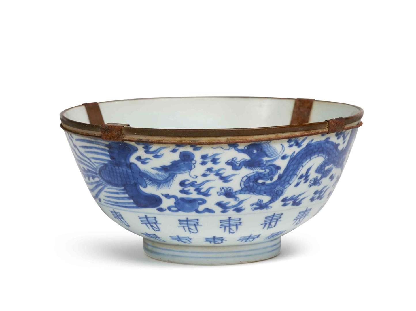 Décoré d'une frise de dragons et phénix pourchassant la perle au-dessus d'une frise de caractères de longévité Shou. La lèvre cerclée de métal. La base avec une marque dans un carré.
