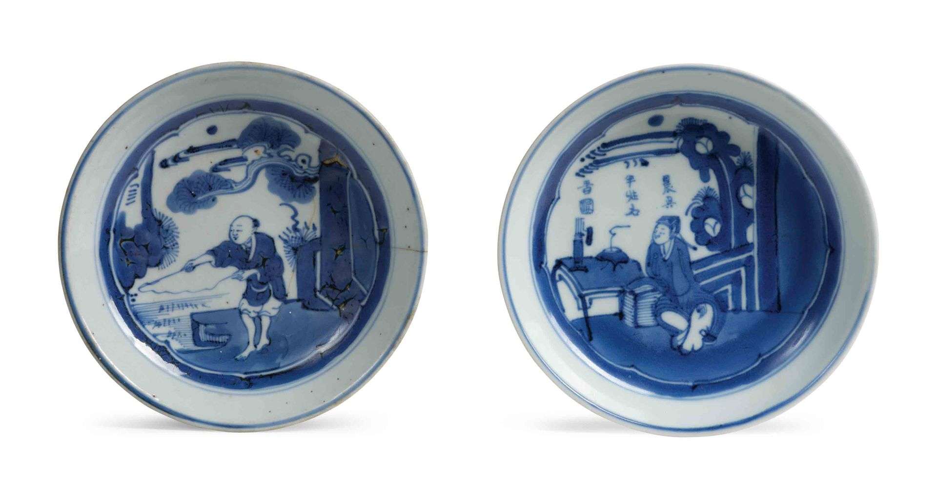 L'une à décor d'un jeune garçon pêchant, l'autre ornée d'un lettré accoudé à une table.
