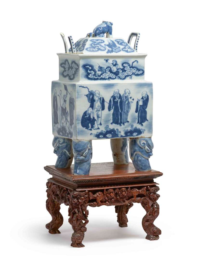De forme quadrangulaire, décoré des seize arhats, la prise du couvercle en forme de lion bouddhique. Avec un socle en bois naturel sculpté décoré d'animaux fantastiques.