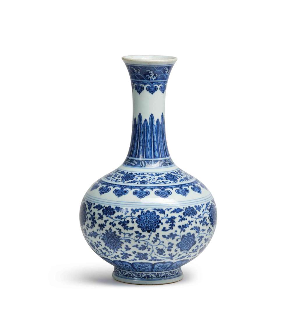La panse de forme globulaire aplatie s'élançant en un haut col légèrement évasé, décorée d'une grande frise de fleurs variées parmi les rinceaux feuillagées et soulignée par des pétales de lotus. L'épaule ornée de têtes de ruyi, frises de fleurs et rinceaux. Le col rehaussé de feuilles de bananiers, têtes de ruyi et frise de vagues. La base avec une marque Qianlong à six caractères en zhuanshu.