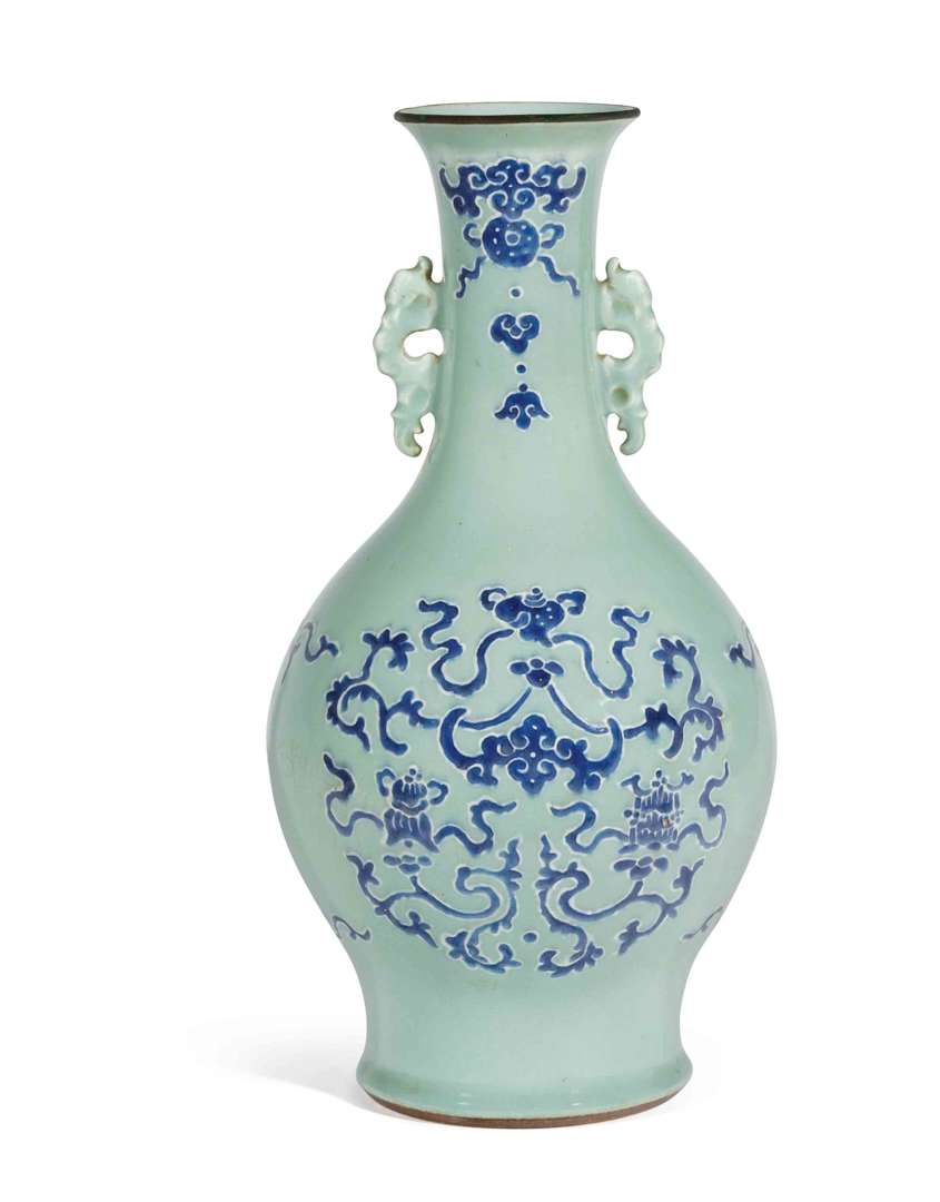 Décoré en bleu sous couverte des "Huit Emblèmes Bouddhiques" parmi les chauve-souris et rinceaux stylisés. L'ensemble se détachant sur une couverte monochrome céladon. La lèvre cerclée de métal. La base avec une marque Qianlong à six caractères en zhuanshu en bleu sous couverte.