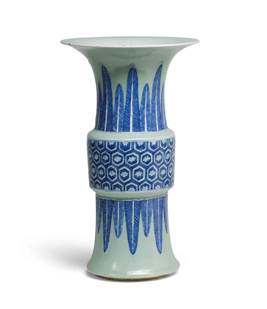 Décoré de motifs de résilles de sapèques et feuilles de bananiers sur fond céladon.
