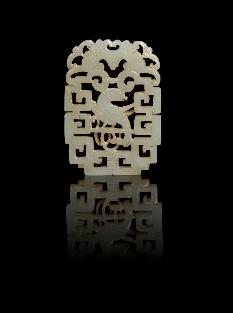 A décor ajouré d'un oiseau parmi les rinceaux archaïsants et surmonté par une chauve-souris.