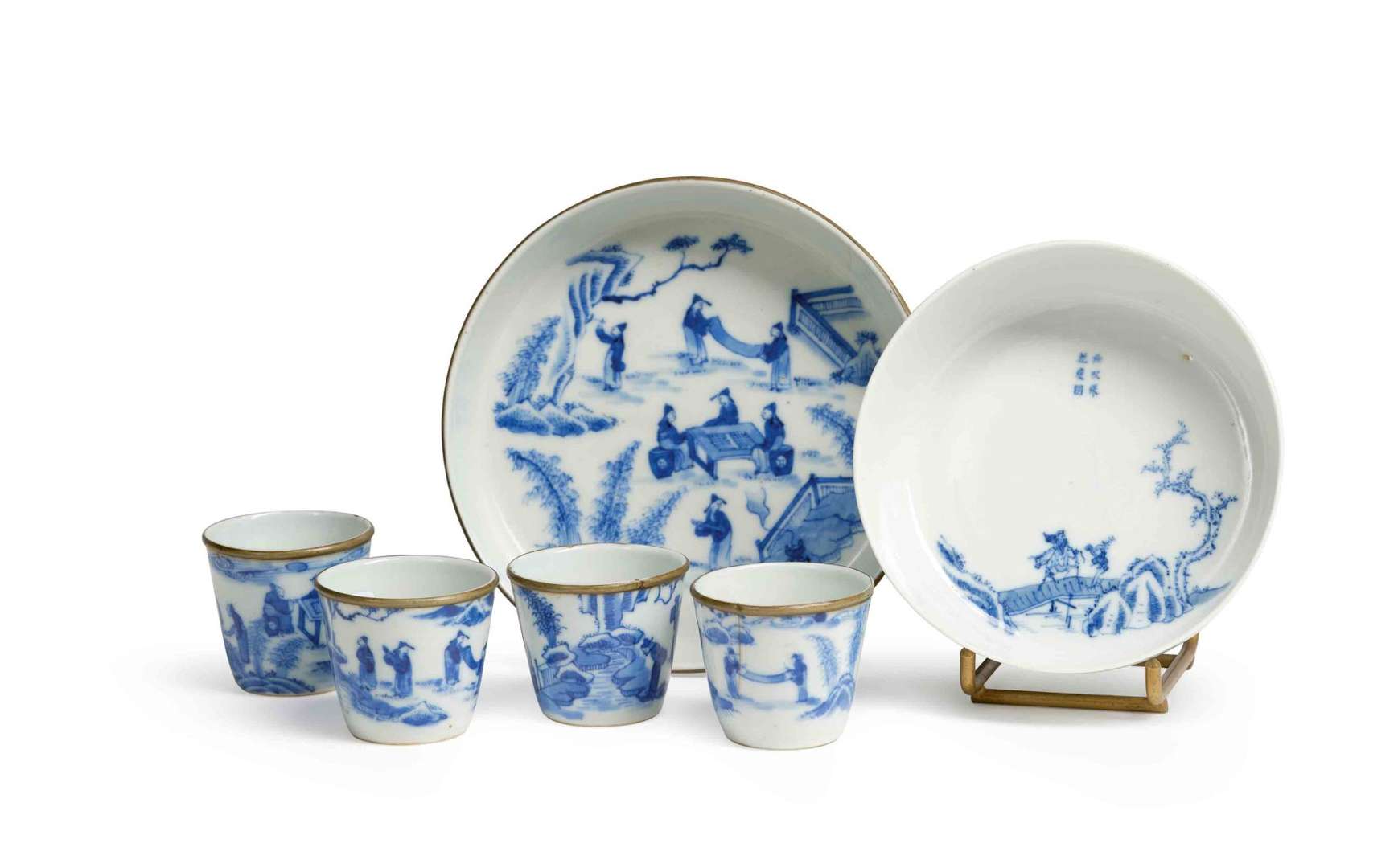 Comprenant un plateau circulaire et qautre petites tasses, décorés de personnages pratiquant les "Quatre Arts du Lettrés" dans un jardin. La lèvre cerclée de métal. La base avec une marque Tuyen Hoa Nien Che ("Fait pendant le règne de Xuanhua").