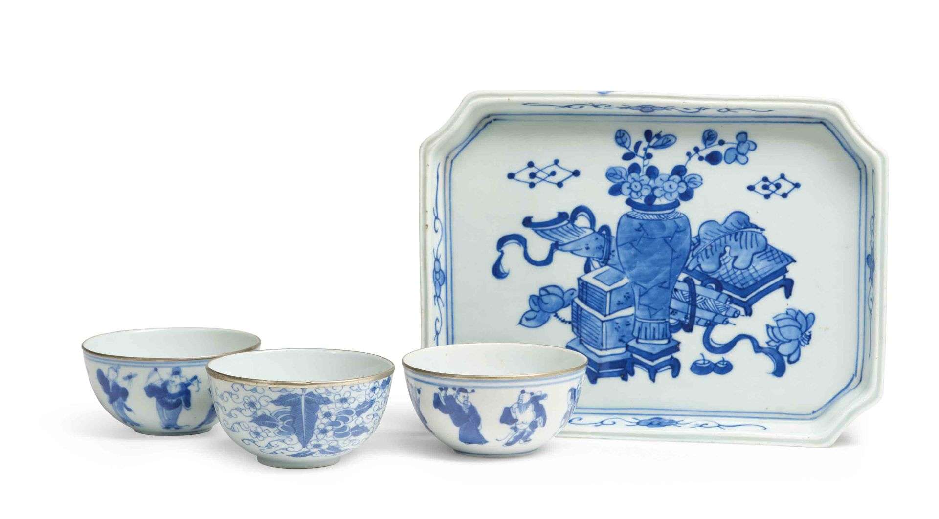 Ensemble comprenant trois bols et un plateau en porcelaine bleu-blanc