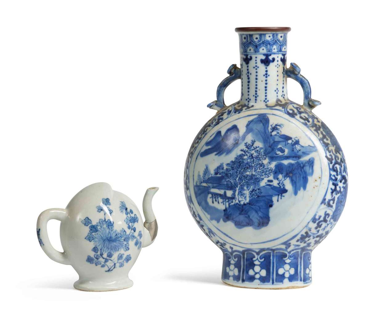 Une théière Cadogan en porcelaine bleu-blanc à décor de fleurs et d'oiseaux. La base avec une marque Kangxi à quatre caractères.