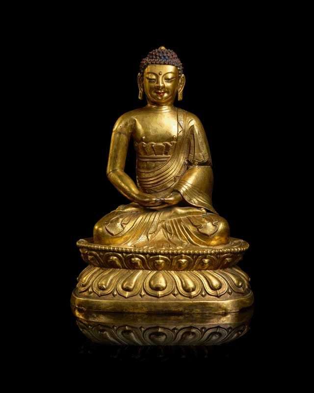 Le bouddha assis en vajrasana sur une double base lotiforme, les mains en dhyana mudra, vêtu d'une robe monastique découvrant son épaule droite et rehaussé d'un liseré de rinceaux floraux. La base scellée