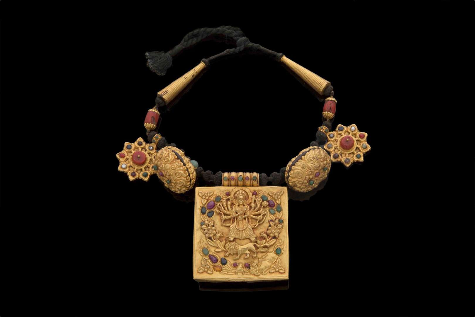 Composé d'une amulette centrale carrée en repoussé orné de la déesse Durga sur un lion avec des rinceaux floraux et incrustations de pierres. Le revers avec les pierres des Navagraha autour d'un cabochon de corail. Le collier en cordelette noire avec deux lingam en repoussé et deux navaratna.