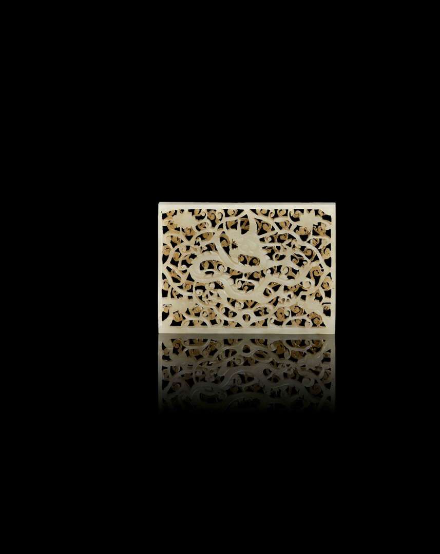 De forme rectangulaire, à décor réticulé d'un dragon pourchassant la perle parmi les fleurs et les rinceaux.