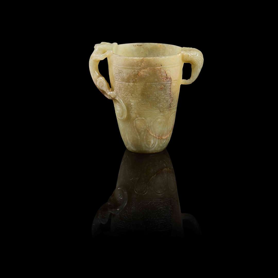 Sculpté de motifs archaïques, avec une anse figurant un chilong, l'autre en forme de tête d'éléphant. La base avec une marque de style archaïque en quatre caractères.