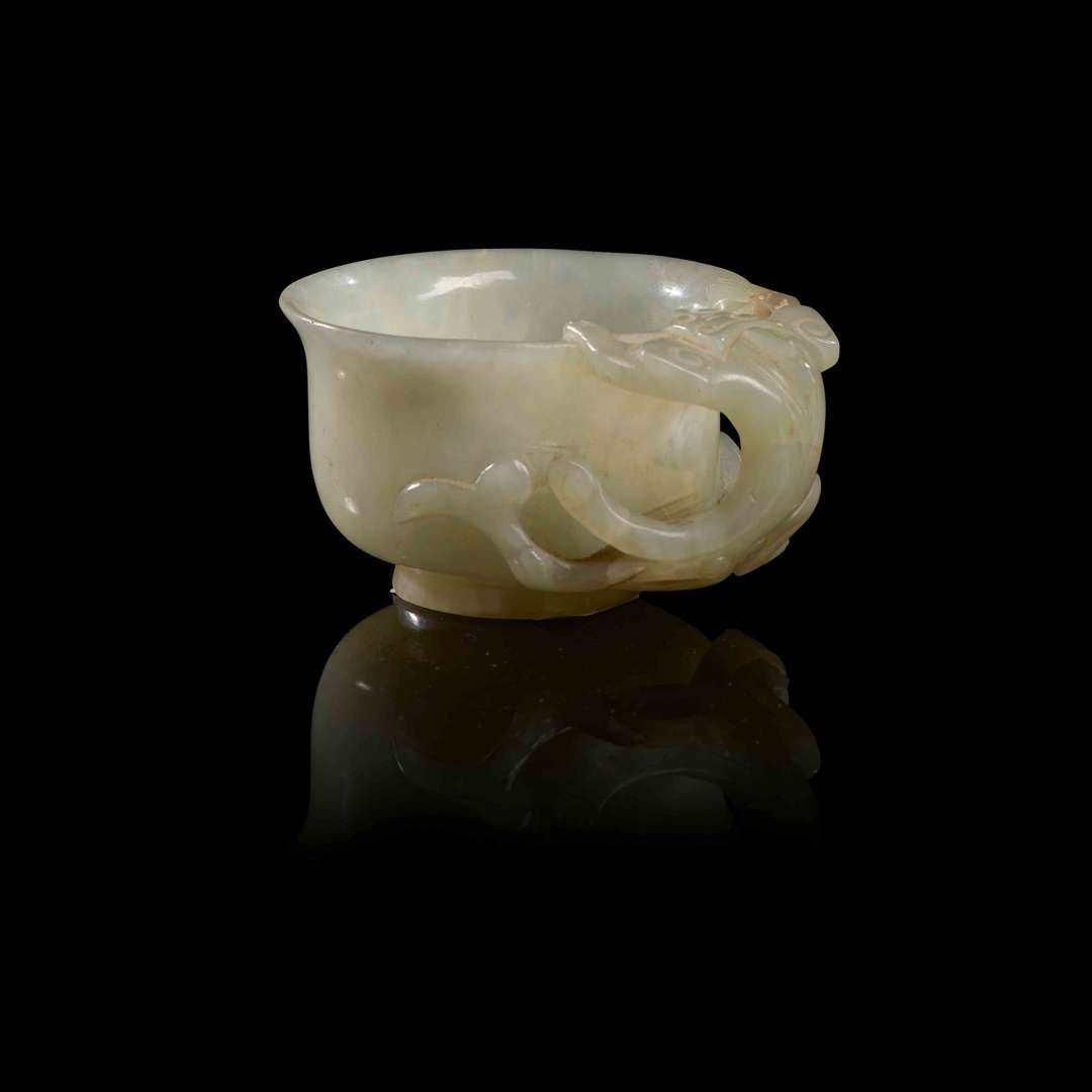 Reposant sur un court pied, la lèvre évasée, l'anse en forme de chilong.