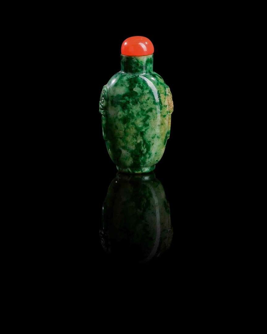 De forme ovale allongée, avec des têtes de lions bouddhiques tenant des anneaux sur les côtés. Avec un bouchon en pierre dure sculpté.