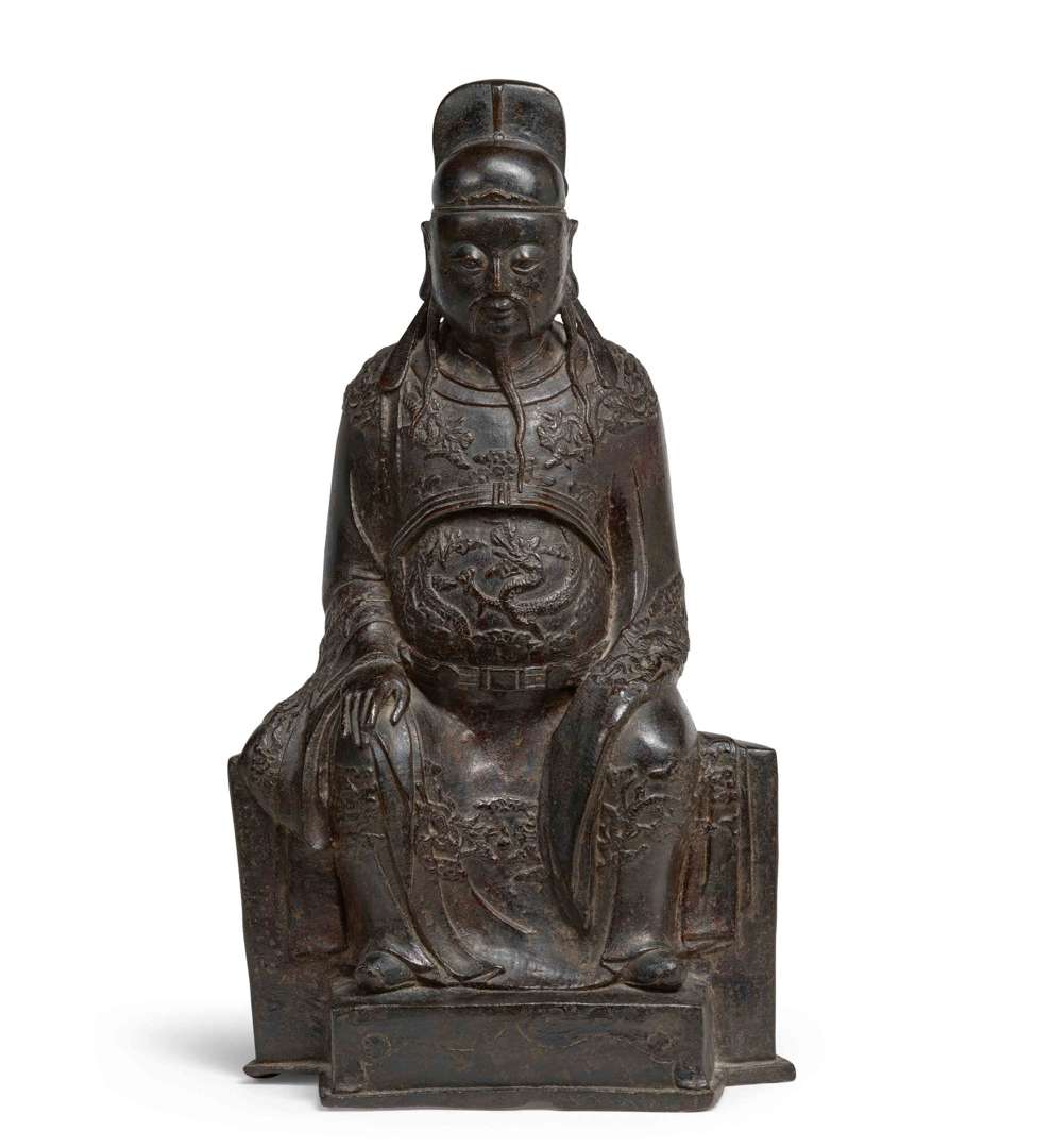 Figurant un officiel céleste assis, vêtu d'une robe de cour à longues manches orné de dragon, coiffé d'un bonnet de lettré.