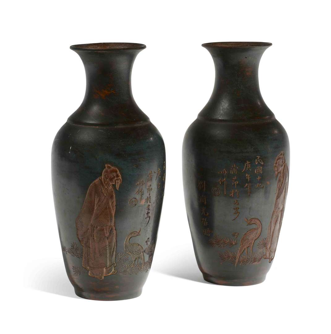 De forme balustre, la panse ornée d'un décor incisé figurant un vieil homme et un phénix. Chacun daté Minguo 19, année Gengwu (1930). La base avec l'inscription "Qin Zhou Pan Wen Guang Zao" (Qinzhou / Fait par Pan Wen Guang). La terre avec de beaux reflets métalliques.