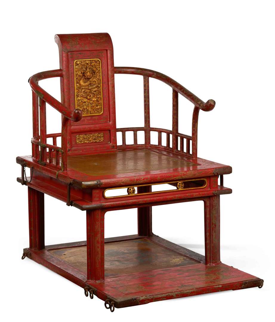 Reposant sur une base s'avançant en repose-pied, avec une large assise et des accoudoirs en fer à cheval. Le dossier décoré d'un dragon ascendant sur une face et des symboles des "Cinq pics sacrés" (Wuyue) sur l'autre. L'ensemble de la structure laquée rouge et ornée de dragons impériaux et phénix pourchassant la perle parmi les nuées en laque gravée rehaussée d'or et de polychromie.