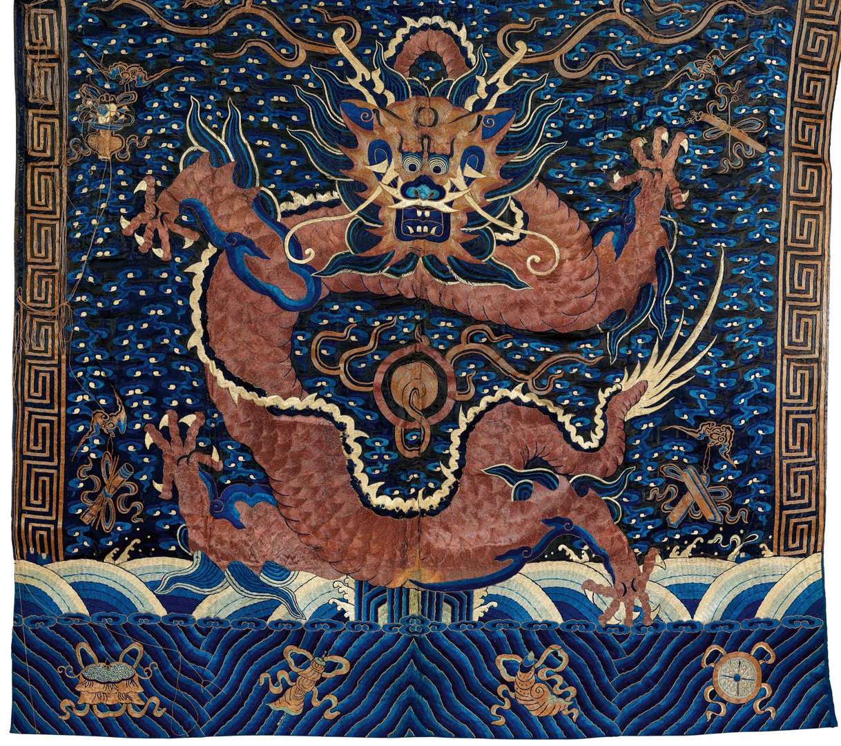 Décoré aux fils polychromes et couchure de fils d'or d'un dragon impérial, représenté de face, pourchassant la perle parmi des nuées peuplées de chauve-souris et symboles des Huit Immortels taoïstes. L'animal survolant une bande de lishui, des flots tumultueux et les pics sacrés où sont figurés des Emblèmes Bouddhiques.L'ensemble cerné par une frise de grecques.