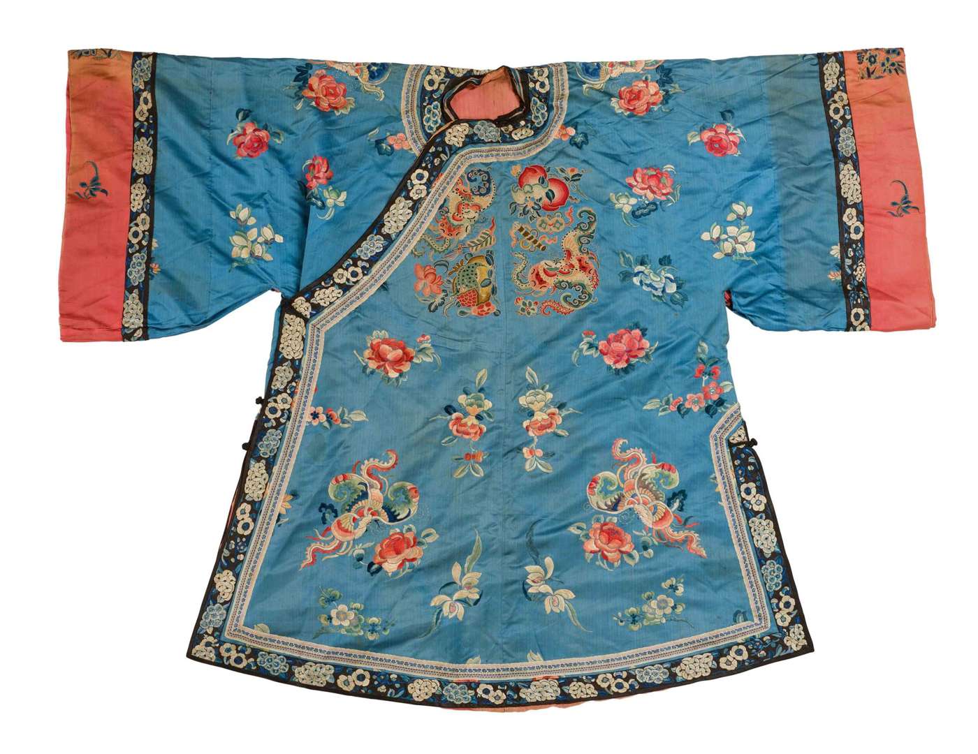 Le centre orné au point de Pékin de papillons, grenades et pêches, le reste du vêteement semé de motifs de fleurs et papillons. Les manches soulignées de fleurs brodées en camaïeu de bleu sur fond corail. L'intérieur doublé de soie corail.