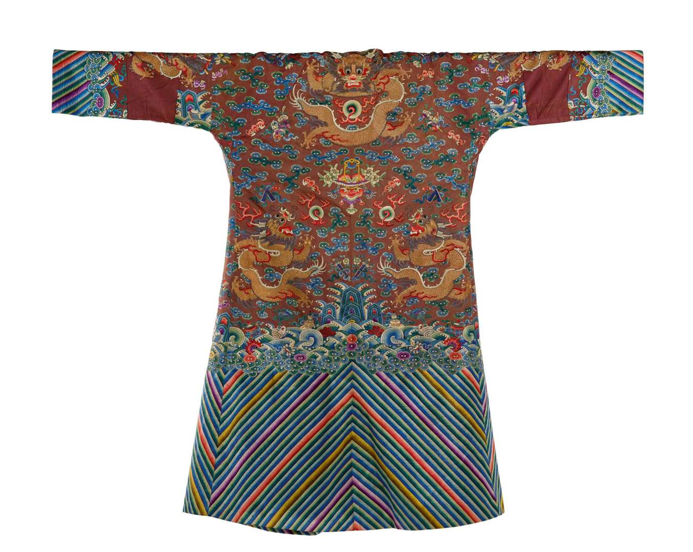 Brodée aux fils polychromes et d'or de dragons à cinq griffes pourchassant la perle parmi des nuages peuplés de chauve-souris et symboles des Huit Immortels Taoïstes, au-dessus d'une bande de lishui surmontée de flots tumulteux d'où émergent les pics sacrés et des objets précieux. Doublée de soie marron.