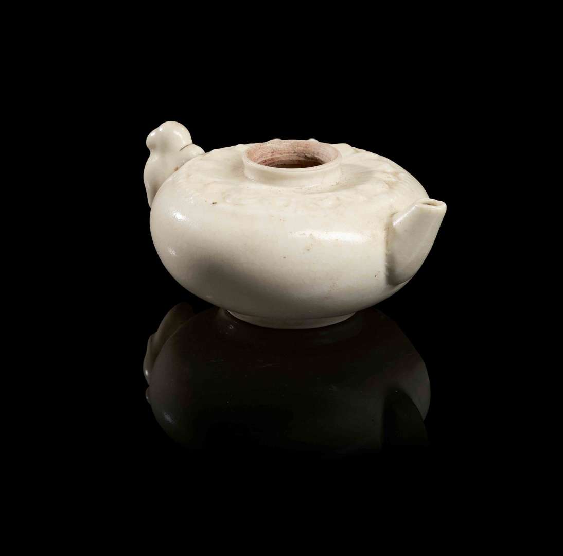 De forme globulaire aplatie, décorée d'une frise de pétales de lotus moulés. La prise en forme d'oiseau stylisé.