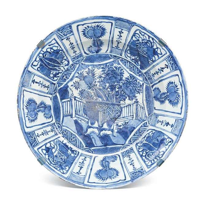 Le centre décoré d'une jardinière fleurie dans une réserve polylobée, le marli orné de pêches de longévité et objets précieux dans des cartouches alternés.