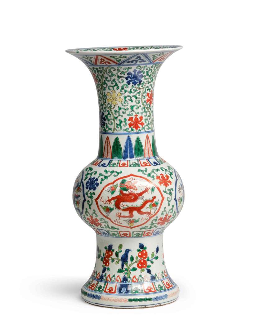 La partie inférieure ornée de tiges de fleurs et frises de pétales. La partie centrale renflée décorée de médaillons polylobés abritant des dragons, et s'élançant en un haut col évasé souligné de feuilles de bananier et rinceaux floraux. La base avec une marque Wanli à six caractères.