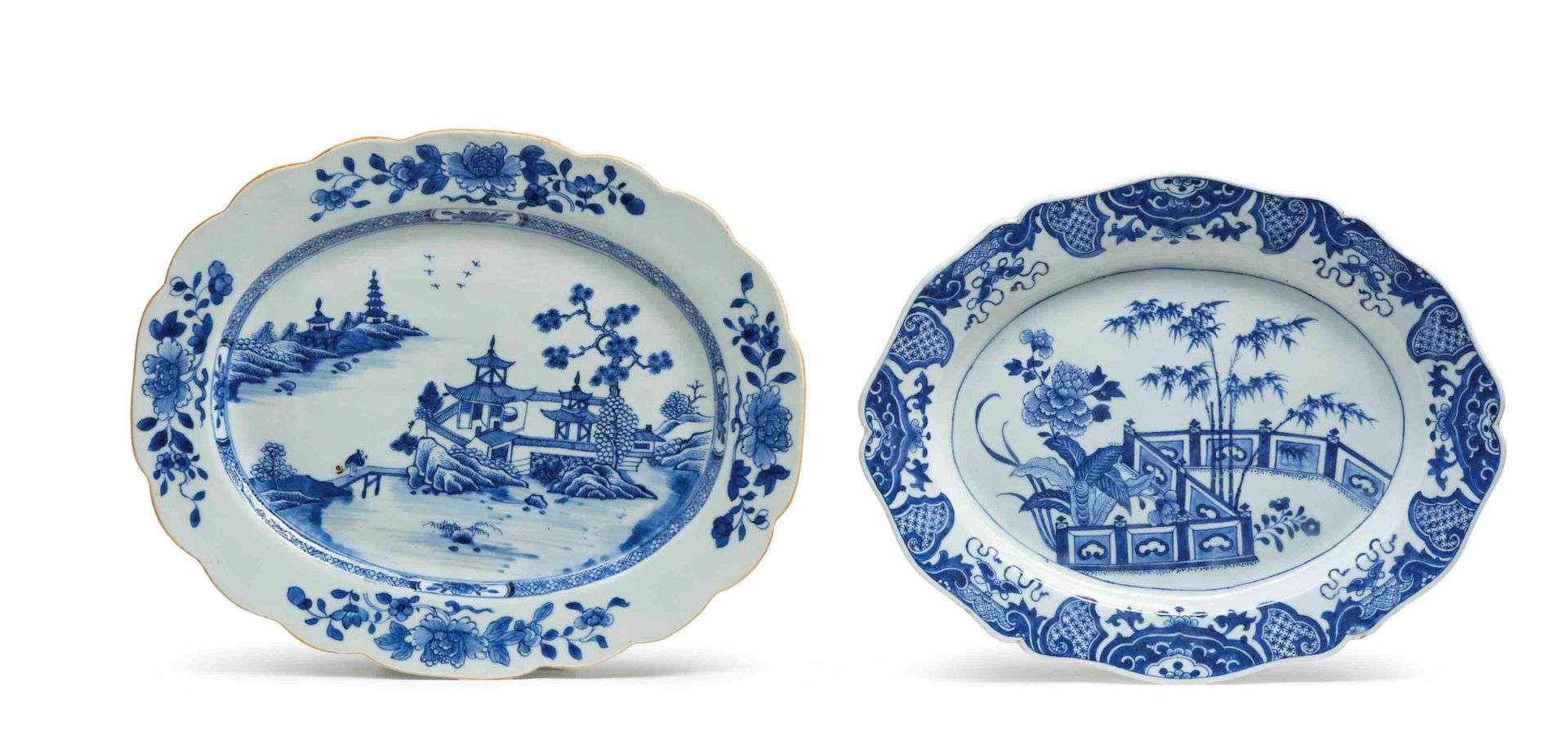De forme chantournée, l'un à décor de jardin, l'autre à décor de paysage lacustre.