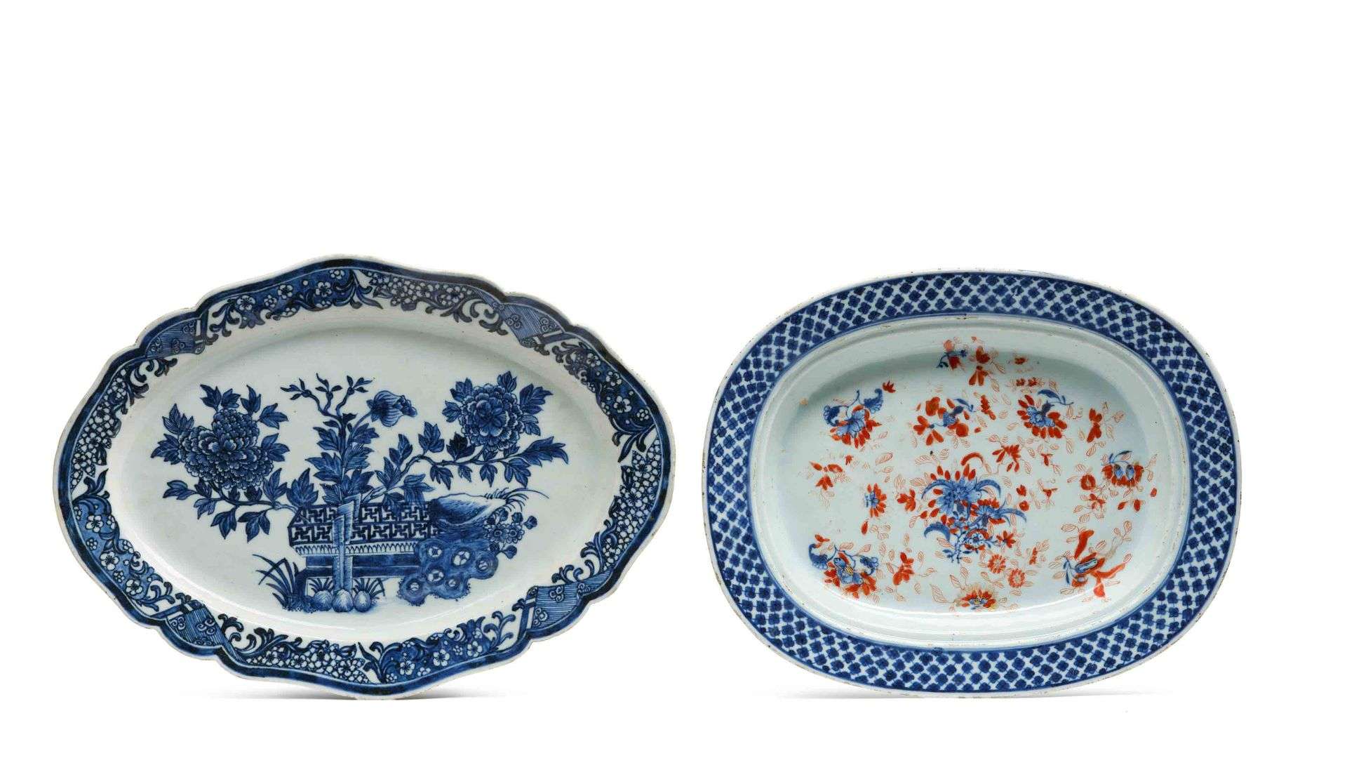 L'un de forme chantournée à décor de jardin de pivoines, l'autre de forme ovale décoré en Imari de fleurs et feuillages.