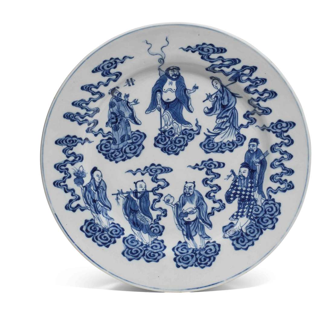 Décorée des Huit Immortels taoïstes sur des nuées. La base avec une marque Xuande à six caractères dans un double cercle en bleu cous couverte.