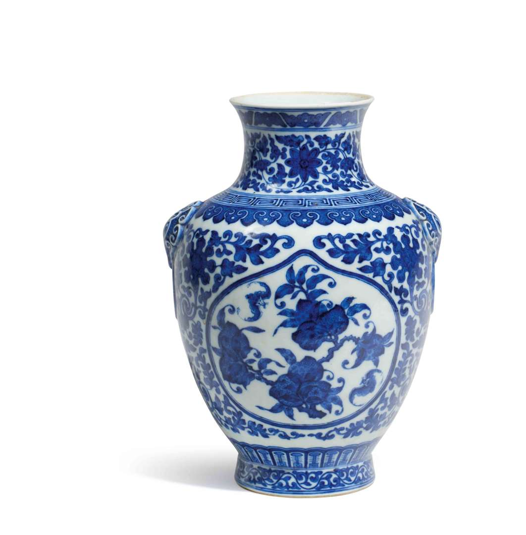 De forme ovoïde, le fond décoré de rinceaux et fleurs dans le style de la dynastie Ming, avec deux réserves abritant des branches chargées de pêches, l'épaule avec deux masques d'animaux appliqués. La base avec une marque Qianlong à six caractères en zhuanshu en bleu sous couverte.