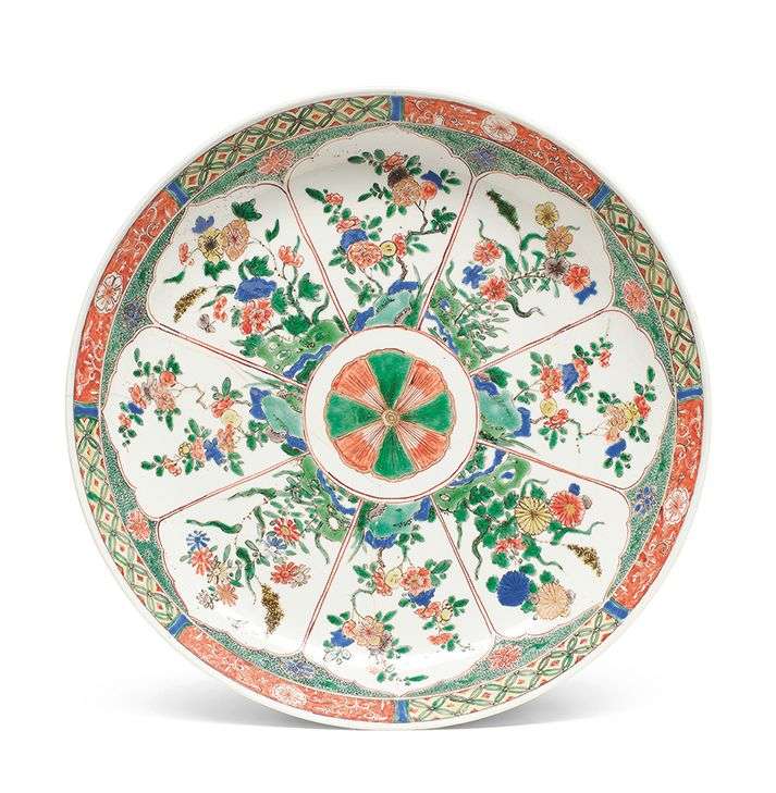 De forme circulaire, décoré aux émaux de la famille verte de huit réserves en formes de pétales de lotus abritant des fleurs variées.