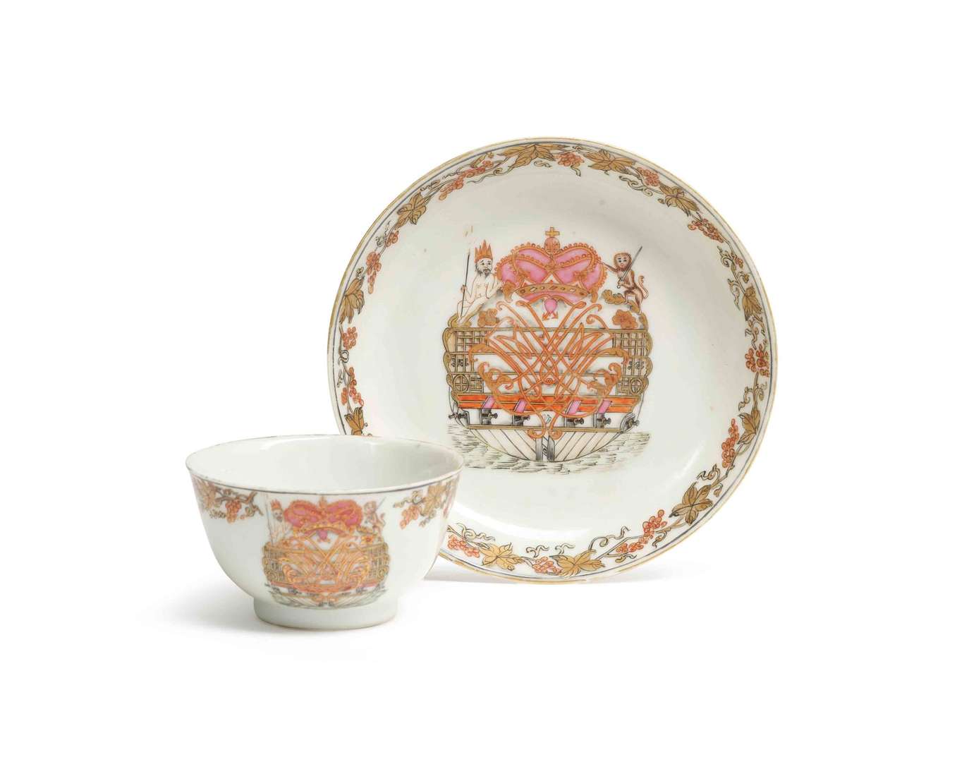 Cette pièce est probablement une commande d'un Jacobite écossais via une des compagnies des Indes scandinaves. Son iconographie très inhabituelle fait possiblement référence à Jacques François Stuart, "Le Roi au-dessus de l'eau" également surnommé le "Vieux Prétendant" par ses adversaires. Une pièce similaire illustrée dans HOWARD, "Chinese Armorial Porcelain", n°F7, p. 274.