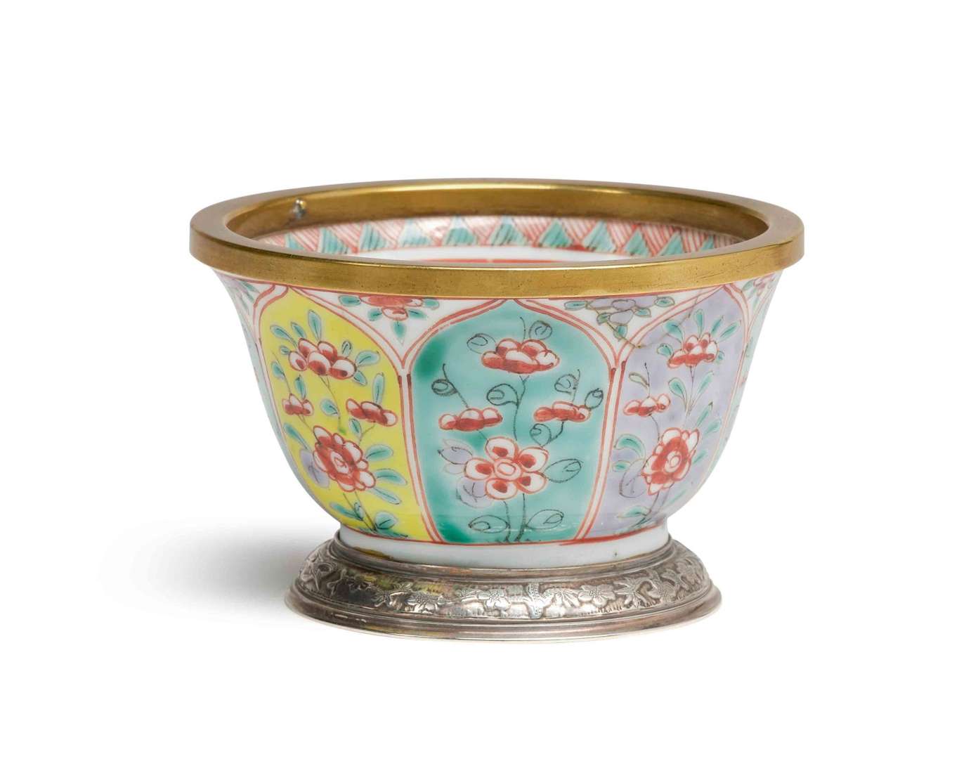Décoré de réserves en forme de pétales de lotus peuplées de tiges fleuries. La lèvre soulignée d'une monture en laiton postérieure. Le pied enchassé dans une monture en argent ciselé postérieure à décor de fleurs et oiseaux.