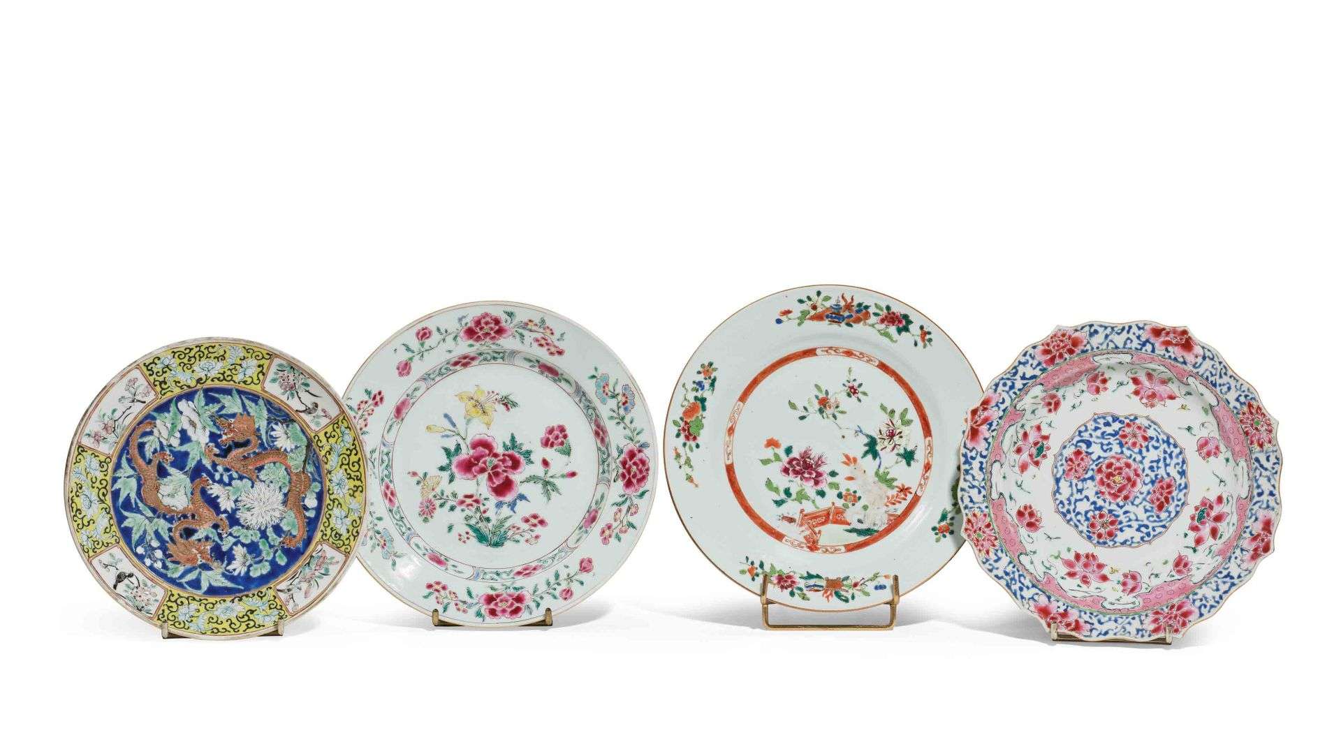 Ensemble de trois assiettes en porcelaine de la famille rose