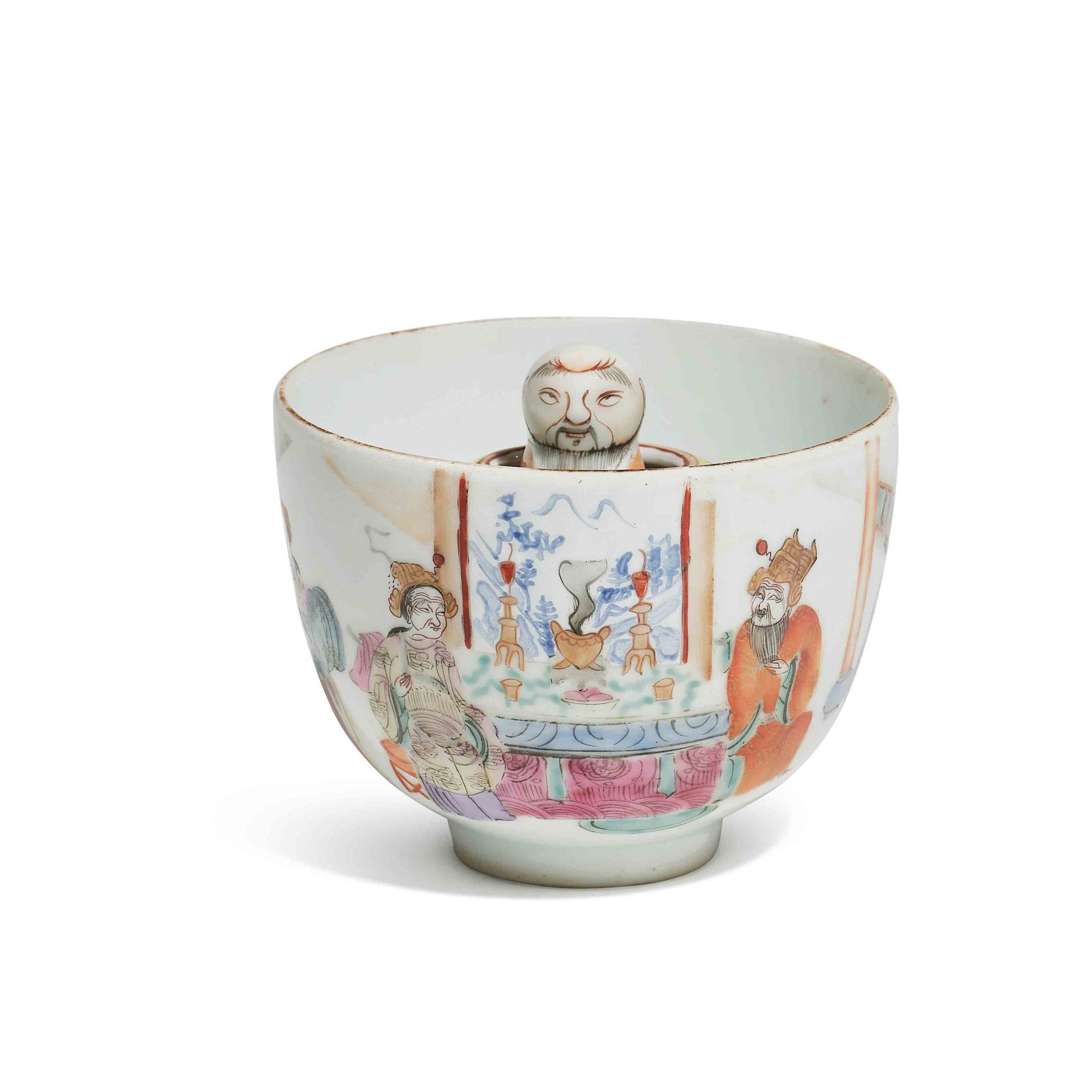 L'intérieur avec une coupe renversée soulignée de têtes de ruyi et abritant une petite effigie mobile de lettré. L'extérieur décoré de personnages dans un riche intérieur palatial. La base avec une marque Tongzhi à six caractères en zhuanshu en rouge-de-fer.