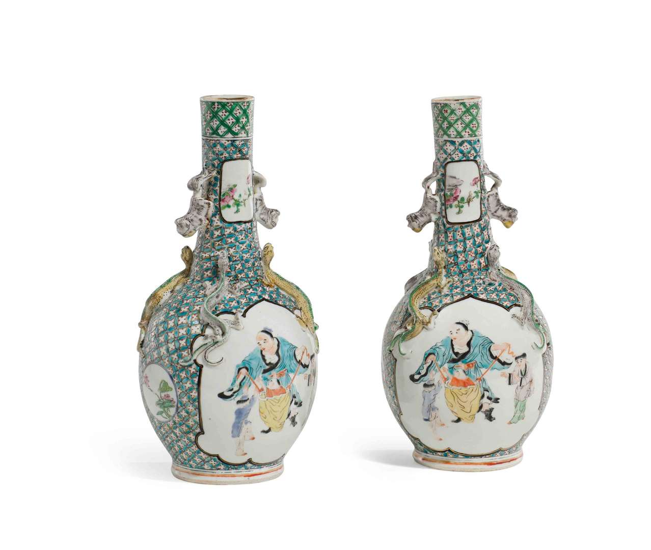 Décorés aux émaux polychromes de réserves avec des immortels taoïstes se détachant sur une dense résille de sapèques. L'ensemble rehaussé de petits chilong appliqués en relief.