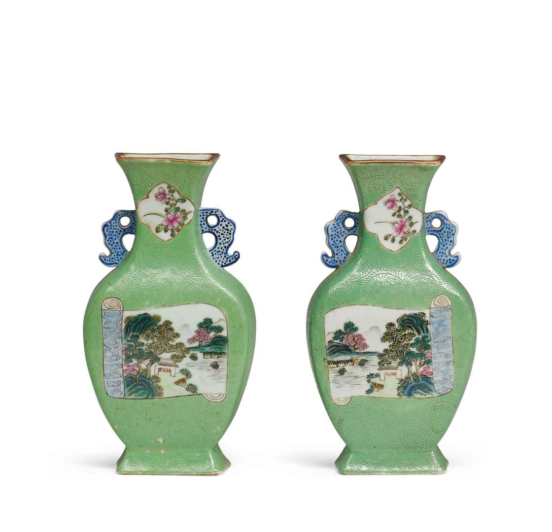 Décorés de réserves en forme de rouleau abritant des paysages lacustres peint aux émaux de la famille rose. L'ensemble se détachant sur un fond vert pâle rehaussé de rinceaux en sgrafiatto.