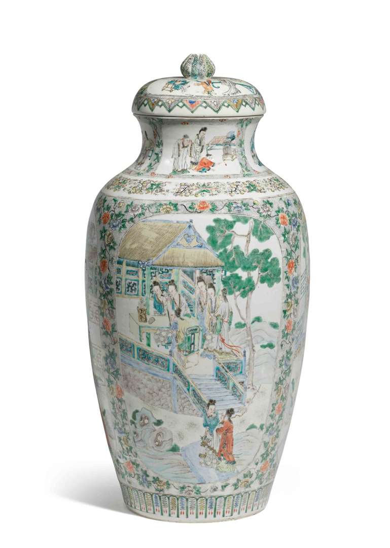 Décoré aux émaux polychromes de grandes réserves peuplées de personnages dans des palais et jardins. L'ensemble se détachant sur un dense fond de rinceaux fleuris et semis de pointillés.