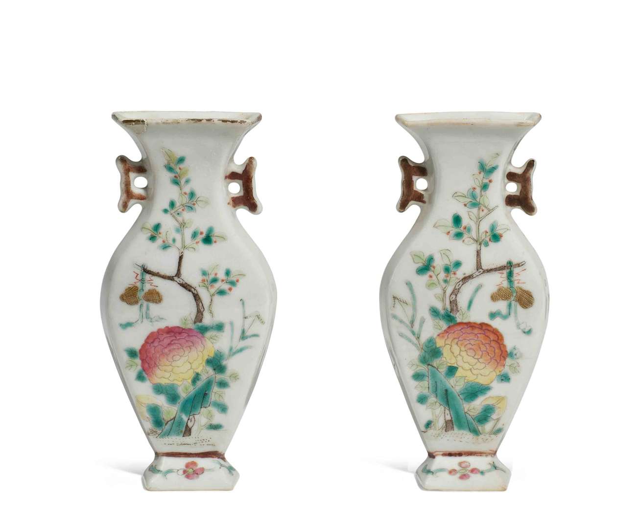 Décorés aux émaux polychromes de pivoines parmi les rochers.