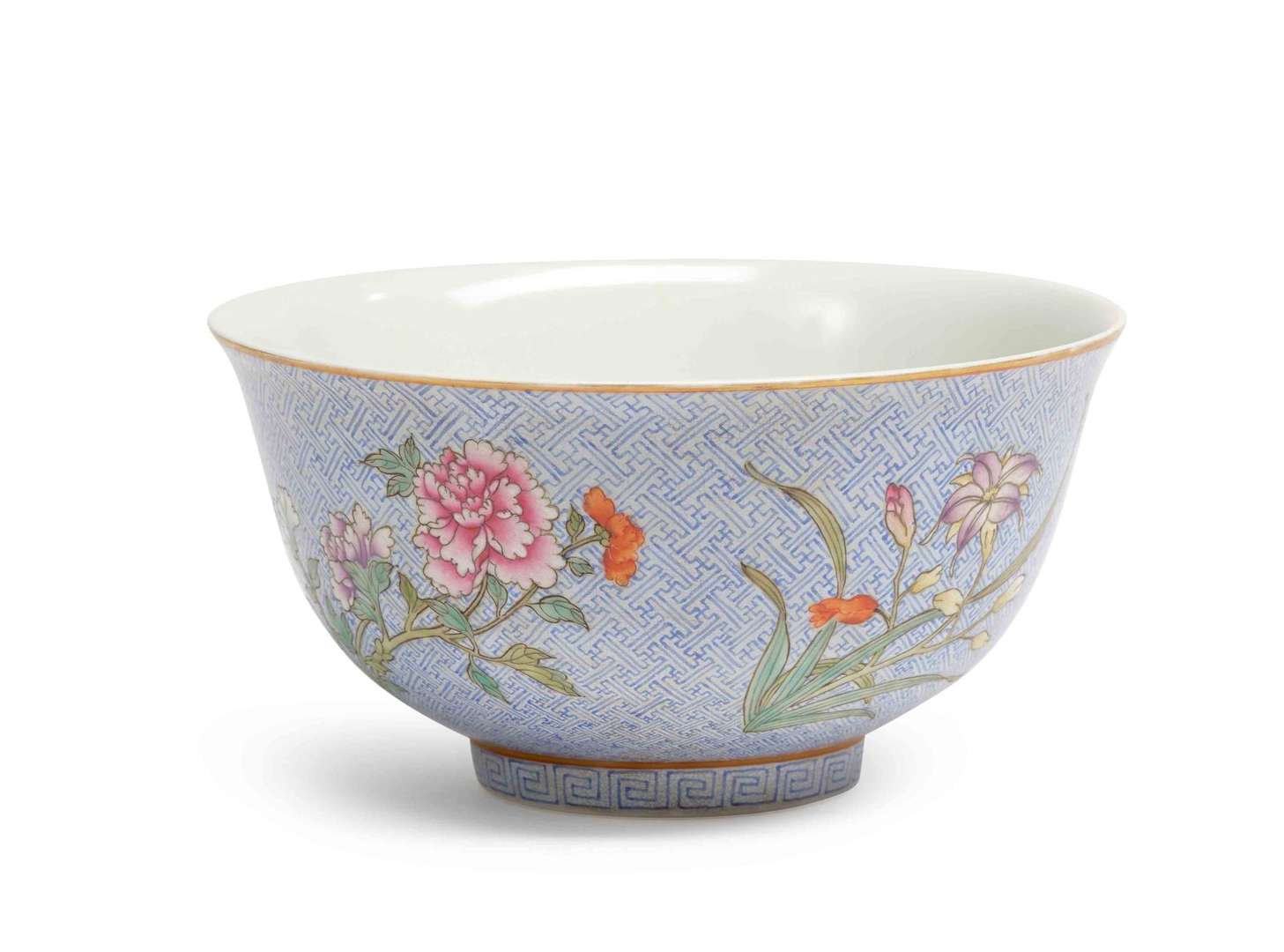 Le corps décoré de tiges de pivoines, lys et chrysanthèmes en fleurs sur un fond de méandre "Wan" bleu. La base avec une marque "Cai Hua Tang Zhi" en rouge-de-fer.