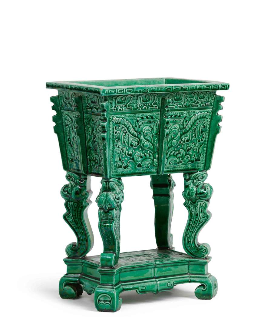 Imitant un bronze archaïque Fangding sur une base avec une marque Xuande, et avec un décor moulé de masques de taotie, dragons kui et frises de leiwen.