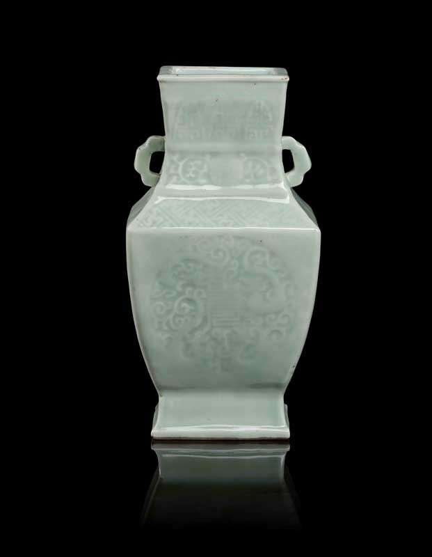A décor moulé de style archaïsant dont des caractères Shou parmi les rinceaux et chilong, dragons kui affrontés et cigales. La base avec une marque incisée Qianlong à six caractères en zhuanshu.